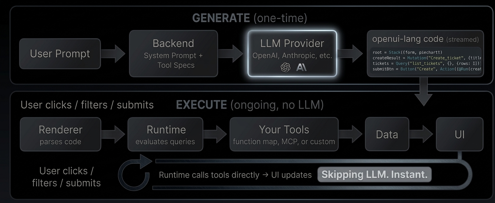 OpenUI separates generation from execution. The LLM generates the interface once. After that, the UI runs on its own: fetching data, handling state, and responding to user actions without any LLM involvement.