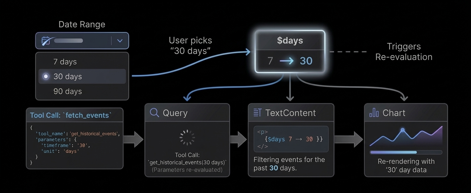 data = Query("analytics", {days: $days}, {rows: []})When $days changes (user picks "30" in the Select), the title updates and the Query